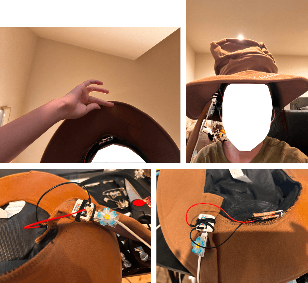 Then I had to decide where to put the copper. But because the hat was so soft, the first and second places I tried were both a clip on the brim, and after putting the hat back on, the two copper overlapped due to the pressure. Unfortunately, because the hat was so soft, the chances of success were not high. I then decided to sew the copper to the brim of the hat, then sew a piece of fabric on, and then sew a copper on the inside. When the person puts on the hat and their head pushes up, the two copper can meet and connect the circuit.
