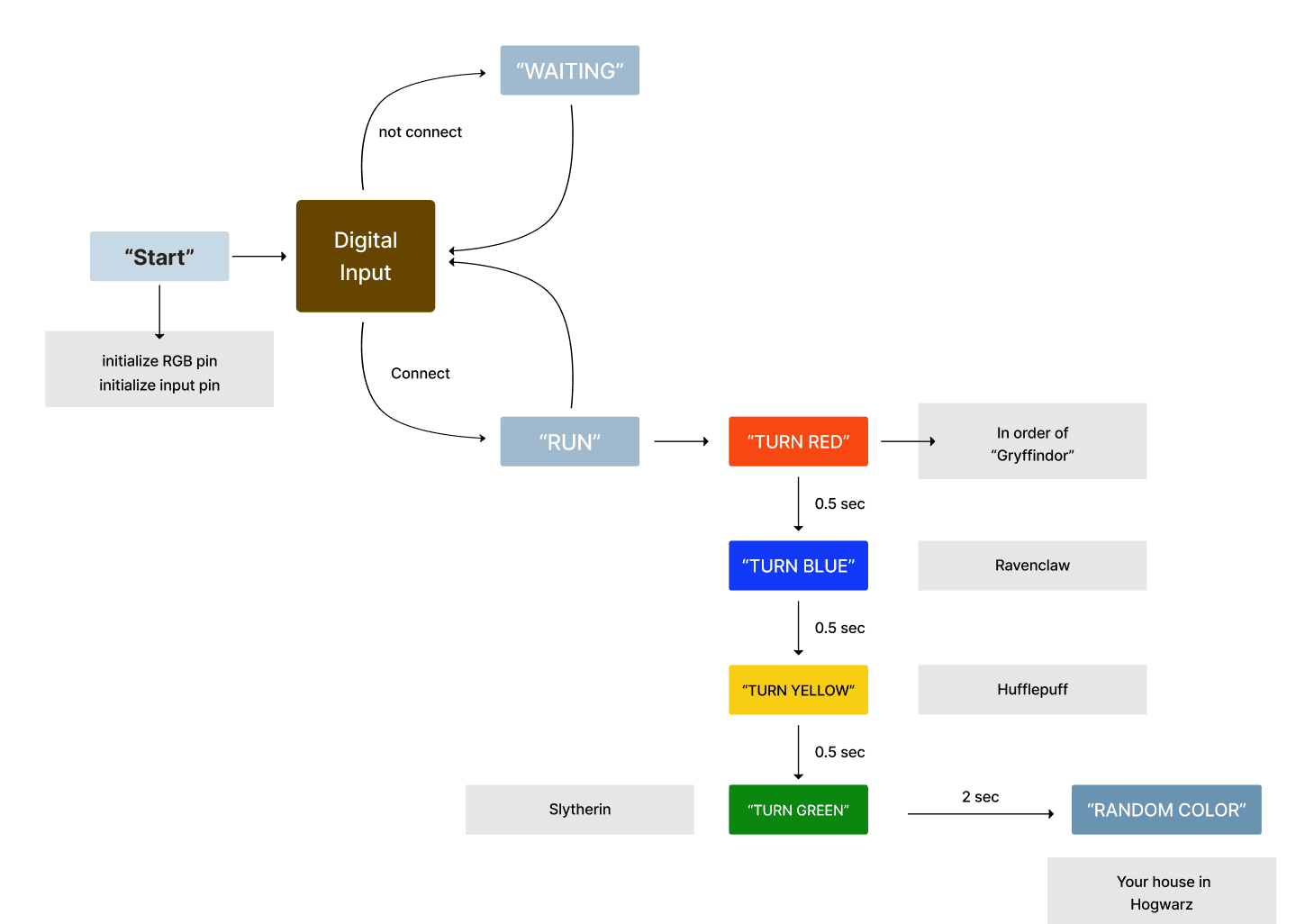 House Selection Function : This function randomly selects a house (using random.randint(1, 4)), retrieves the corresponding color and house name, sets the RGB LEDs to that color, and prints the house name.