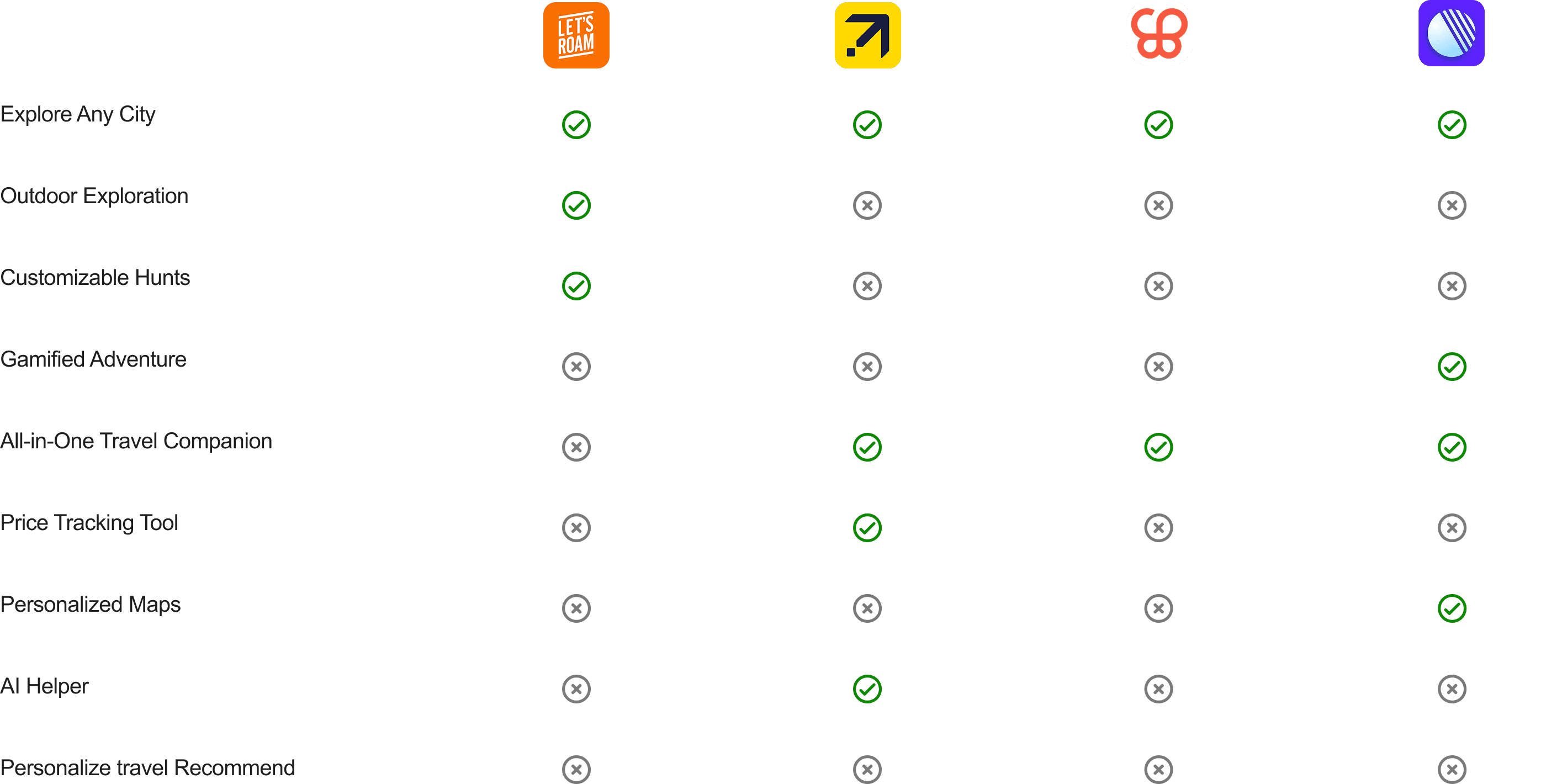 How different competitor have different feature? I've identified different types of existing travel apps in different direction: adventure app, travel booking app, travel planning app, and a travel tracking app.