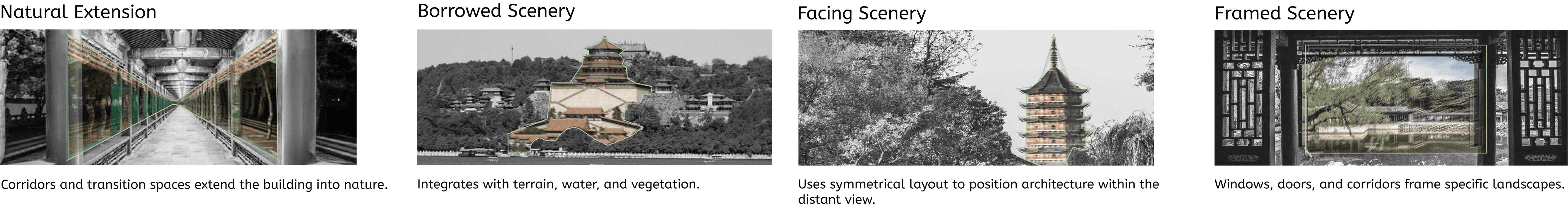 This philosophy emphasizes site selection and environmental adaptability, . Buildings do not dominate the environment but extend naturally, engaging in a 'dialogue' with their surroundings.