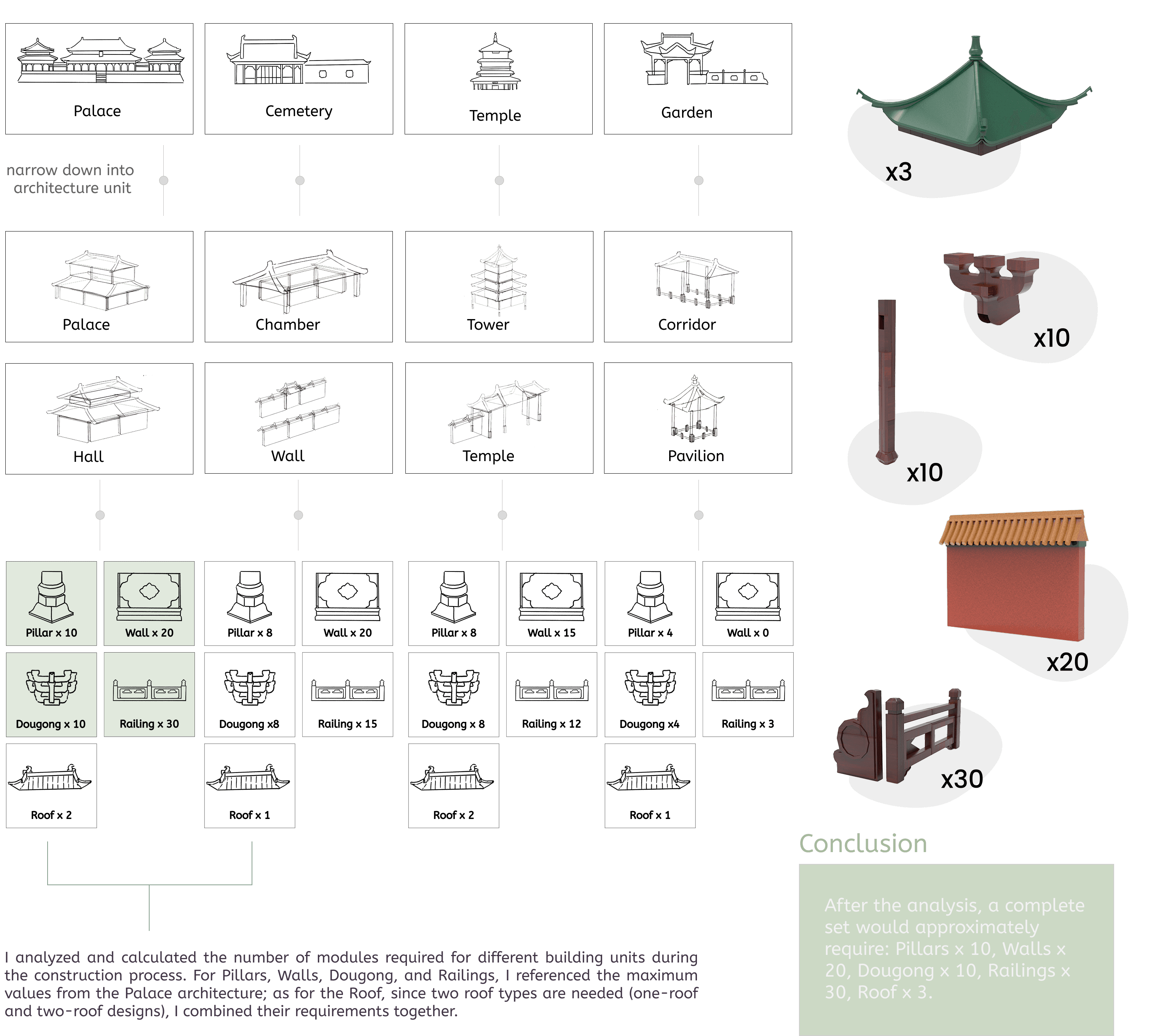 Deconstruct the common architectural types of Yangshi Lei, analyze their structural features, and summarize the core architectural units needed for modular assembly, providing a clear framework for modular construction.