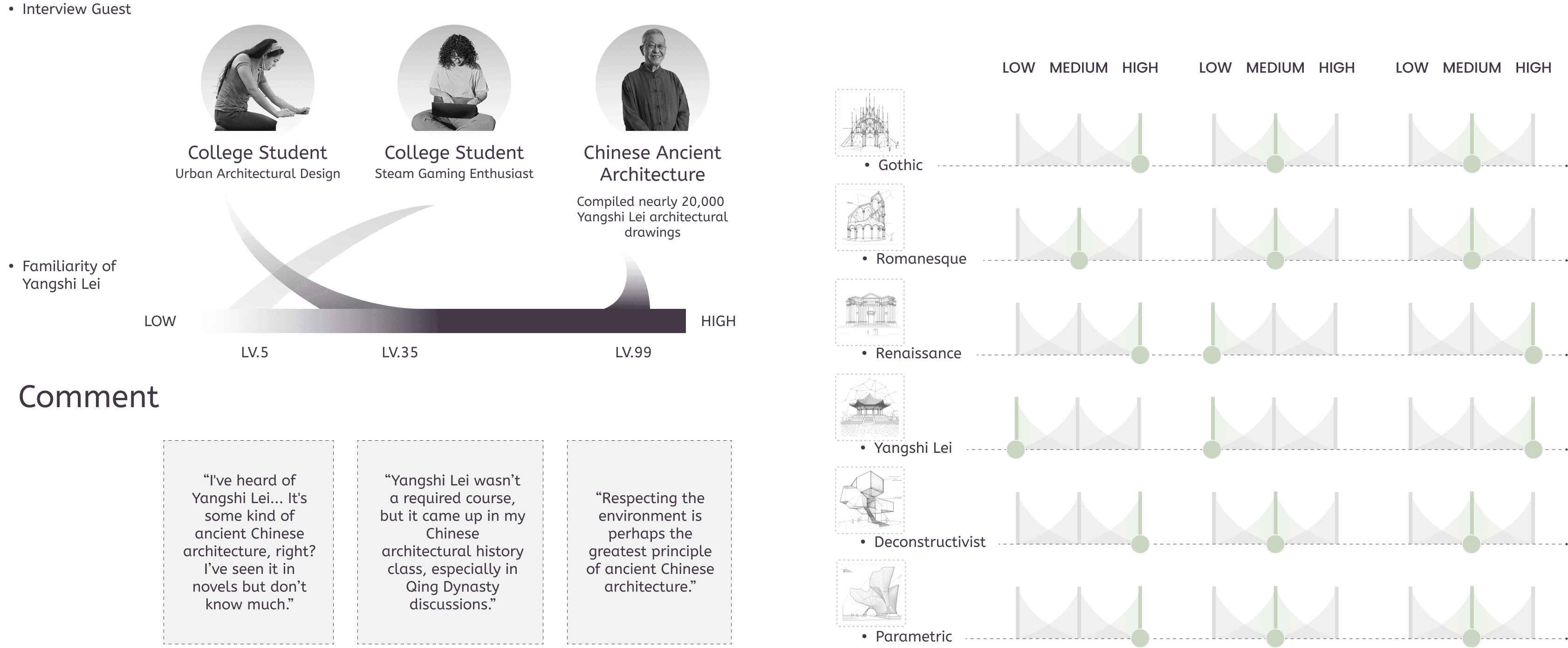 There are big barriers to the dissemination of Stylized Lei architecture, so I wanted to gain insight into the different perspectives and views of various parties. Therefore, I interviewed ordinary university students, architecture students, and senior architecture professors.
